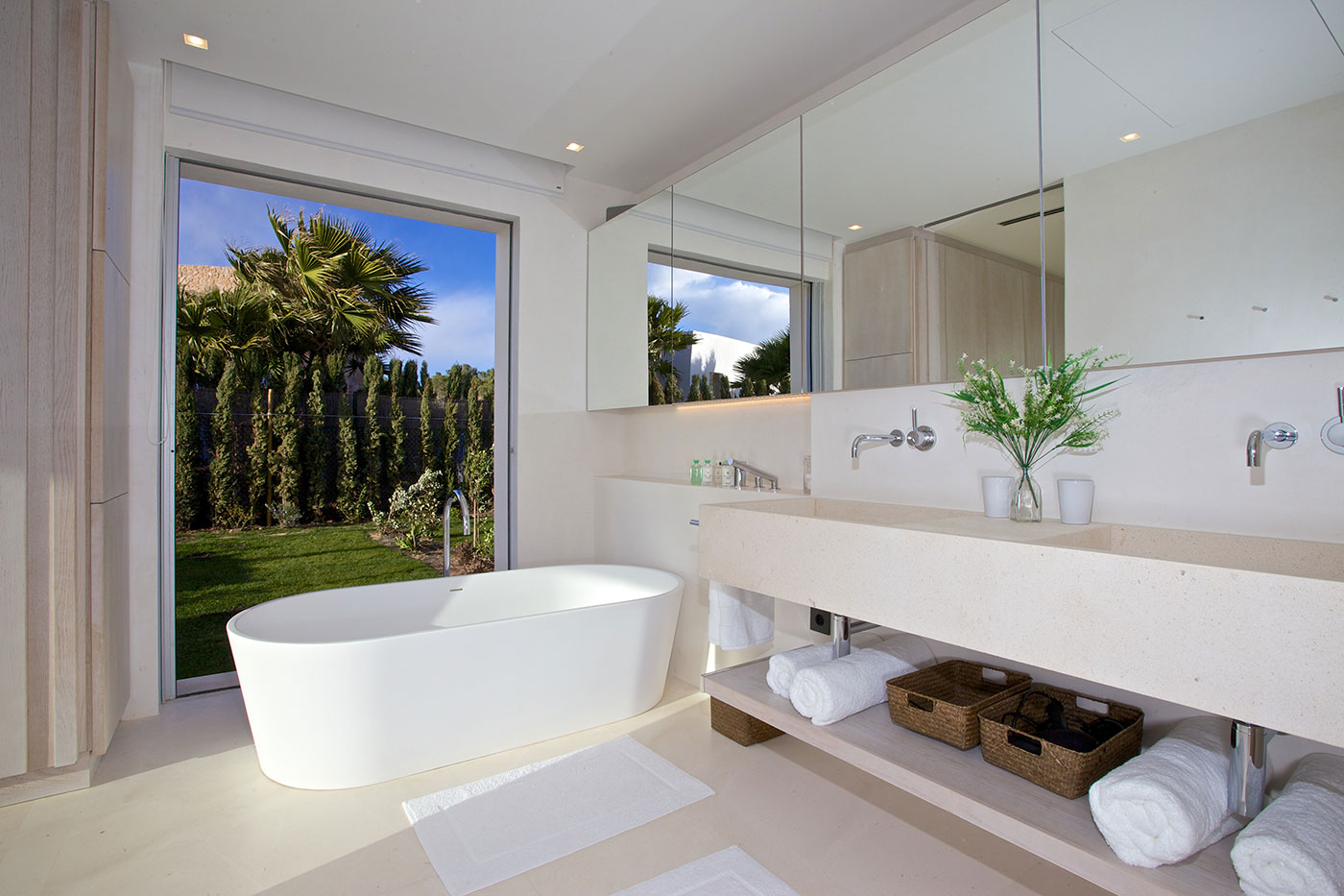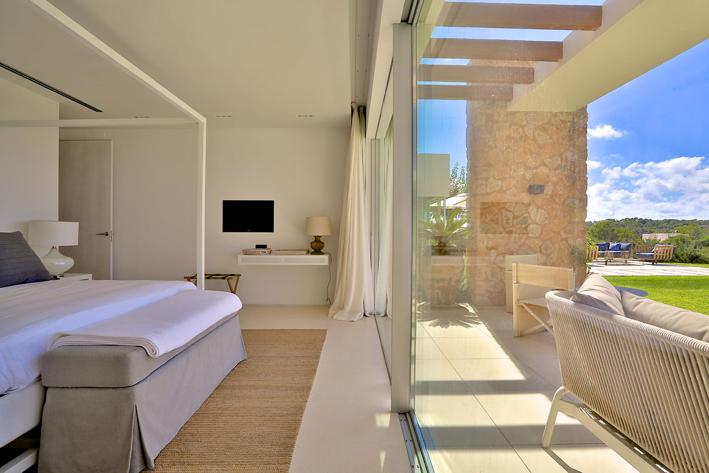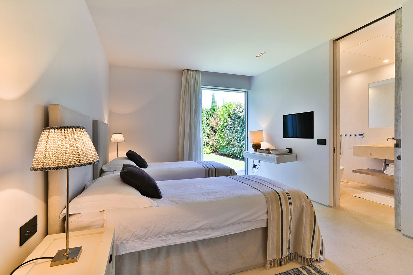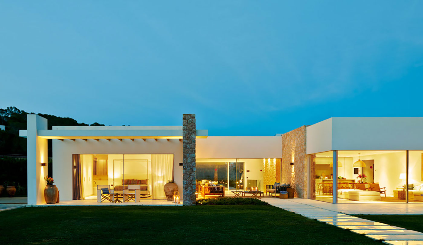 Can Dos Rocas accommodates ten adults in five spacious bedrooms with ensuite bathrooms and two children in one additional room, also with ensuite. Pure luxury blended with cutting edge technology, this architectural gem was recently built in 33 Calaconta, the most exclusive development in the Balearics, gated with 24 hours security, 12 mt Motor Yacht, four sea view shaded terraces, outside dining, swimming pool, barbecue area and direct access to a 300 sq m SPA and Gym. From the house there is a magnificent sea view and the villa is excellently sited to present a sweeping panorama that includes the islands of S’illa des Bosc and Conejera, as well as the famous Balearic sunset.